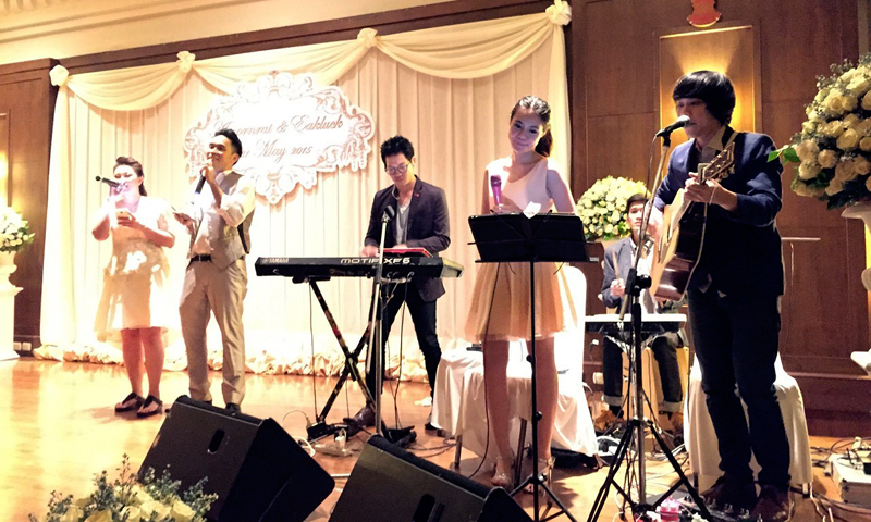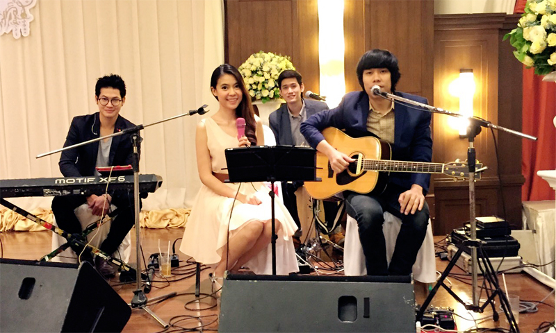 งานแต่งงาน จัดที่ สมาคมธรรมศาสตร์ สาทร ในพระราชูปถัมภ์ มาใน Package แบบ FullBand กับกีต้าร์โปร่ง คีย์บอร์ด กลองคาฮอง พร้อมนักร้องสาววัยใส